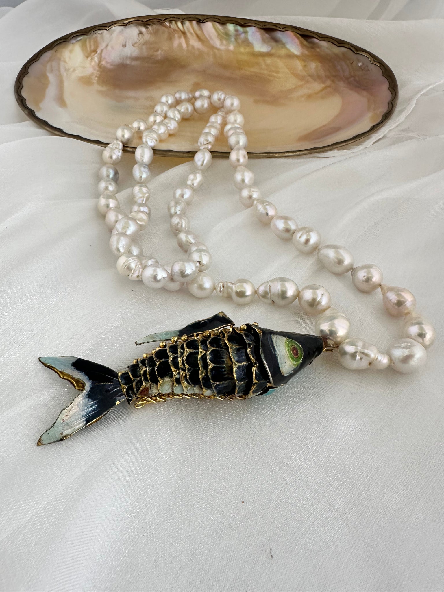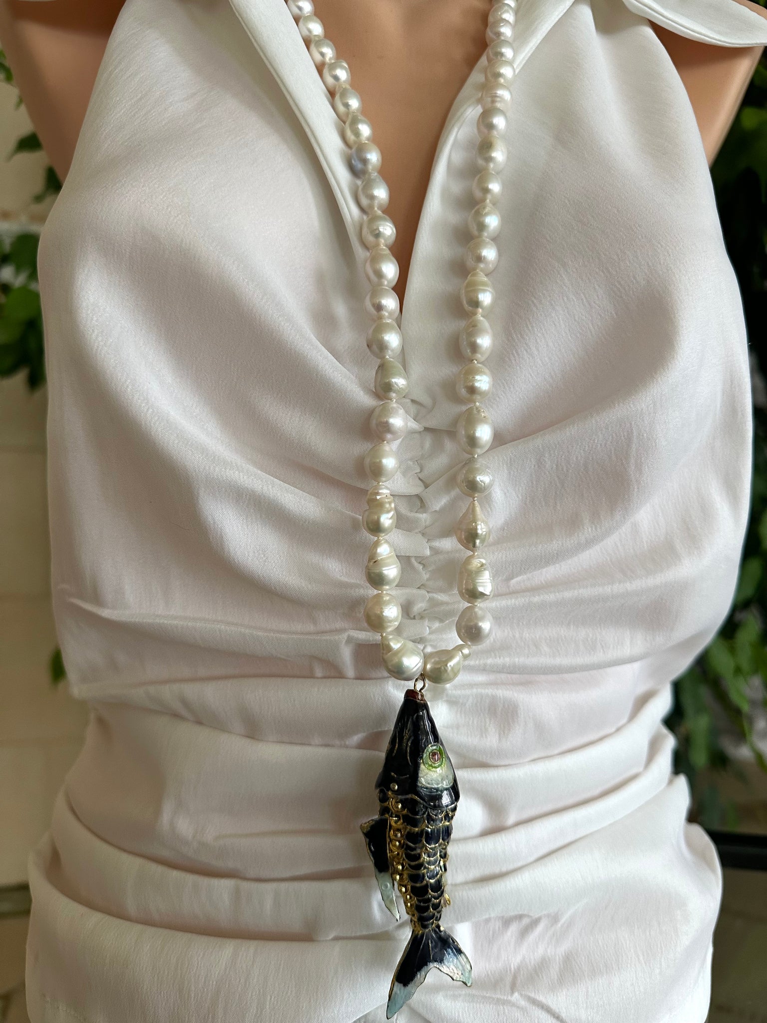 A statement long pearl necklace crafted with hand knotted 9–11mm white baroque pearls and finished with a large black cloisonné fish pendant, designed to be worn long or doubled for versatile styling.