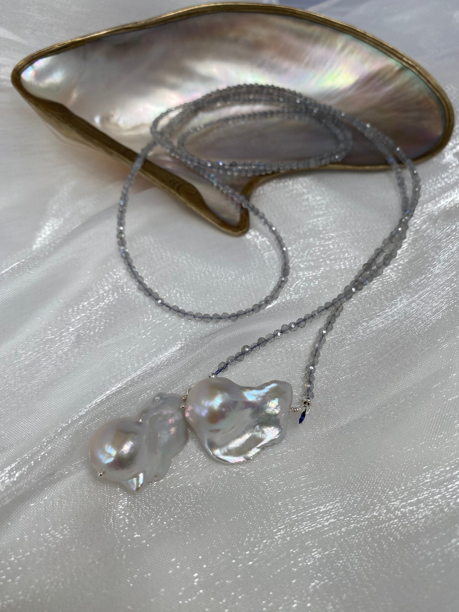 It features a single strand of faceted labradorite beads, I added two large baroque pearls to both ends. Baroque pearls are irregularly shaped, which adds a unique and organic touch to the necklace. The pearls are lustrous and have a natural beauty that is enhanced by their irregular forms.