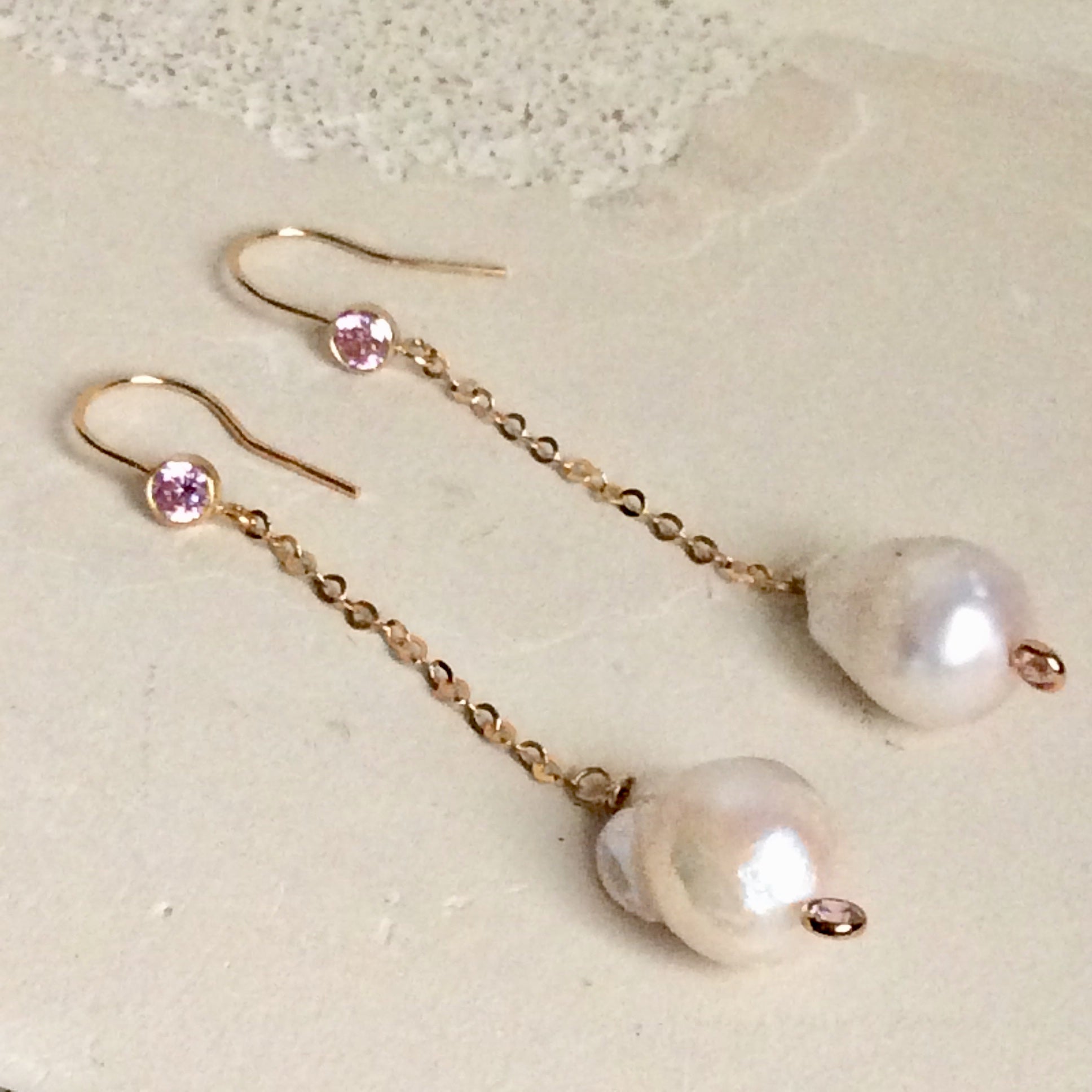 Very elegant long chain earrings with genuine freshwater white baroque pearls, pink bezel cubic zirconia and gold filled chain and hoops.