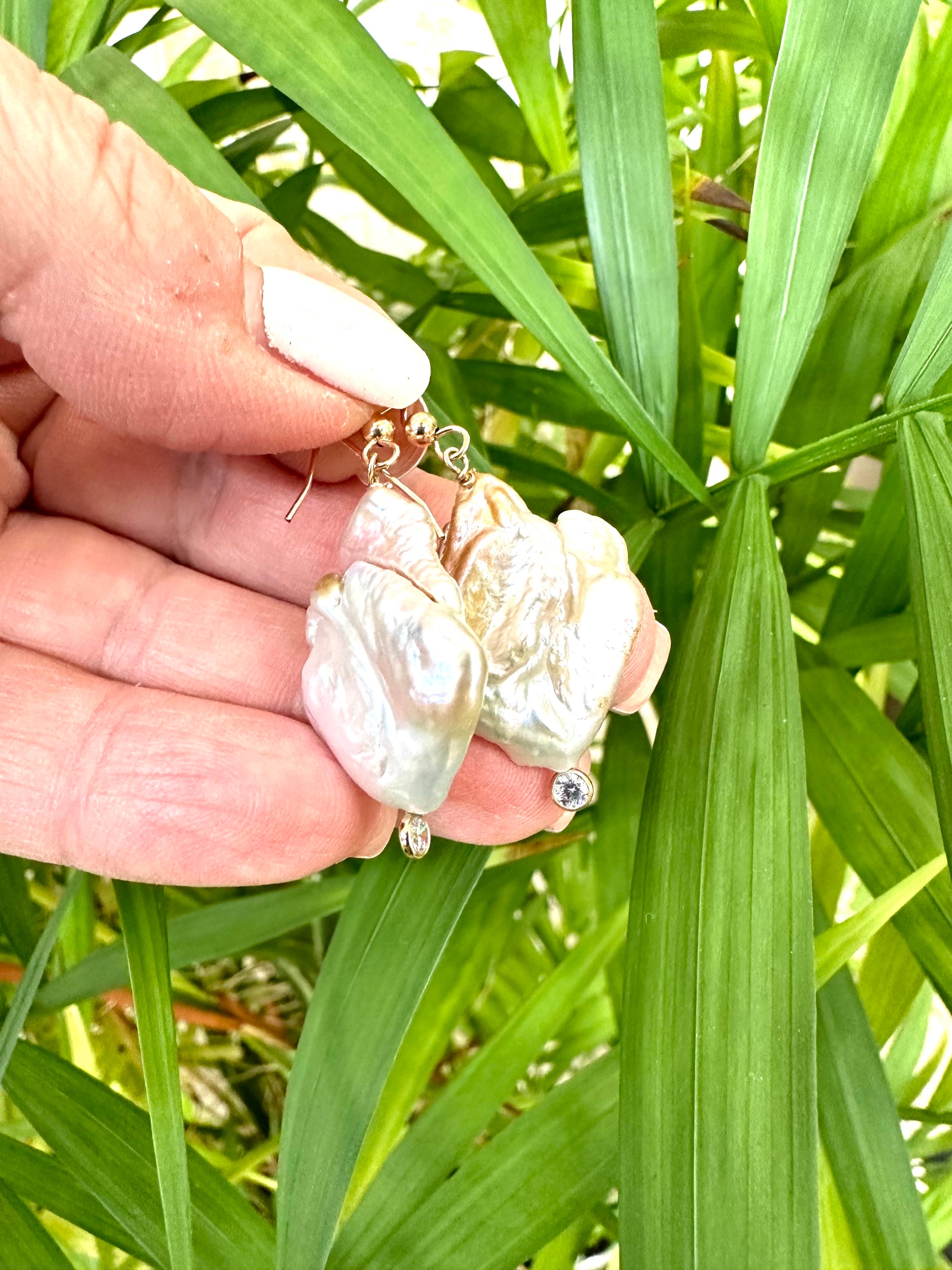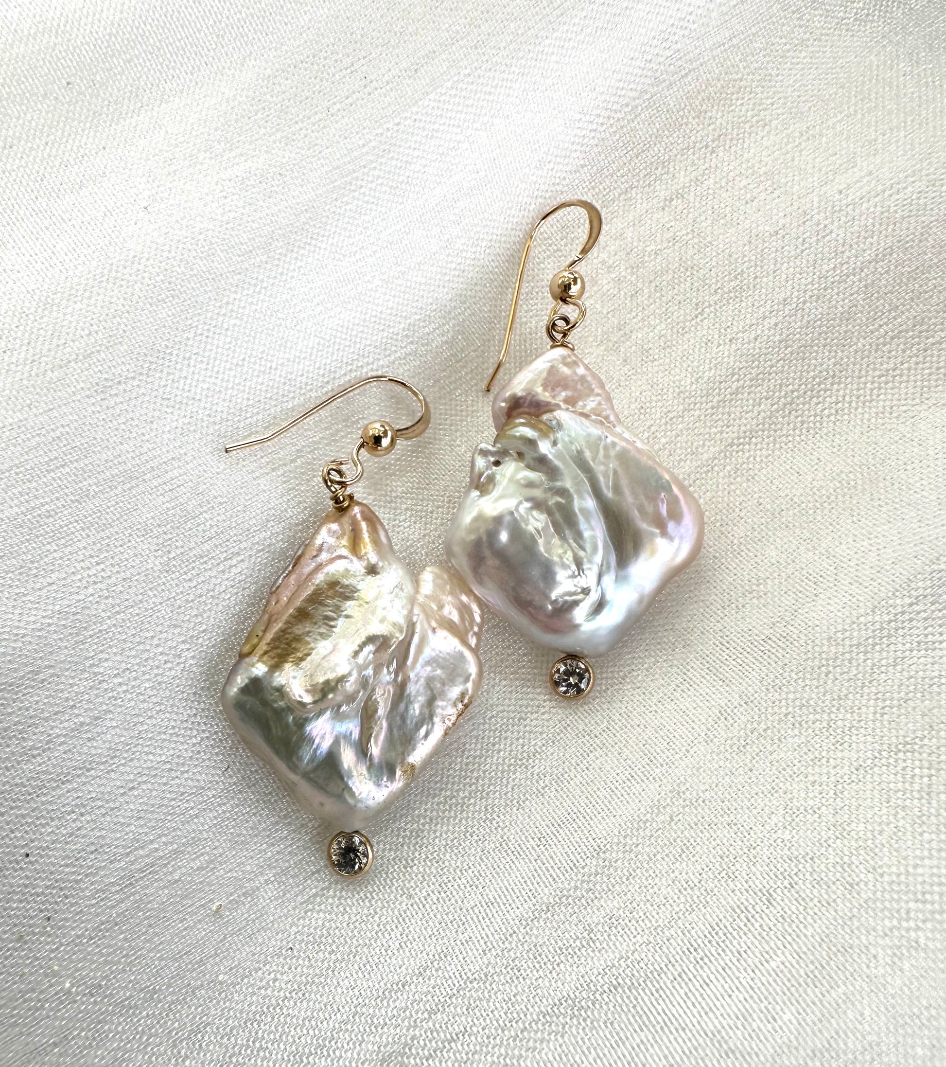 Simple and modern gold filled earrings with clear bezel cubic zirconia and free shape large keshi pearls, these pearls have incredible hues of gold and white.