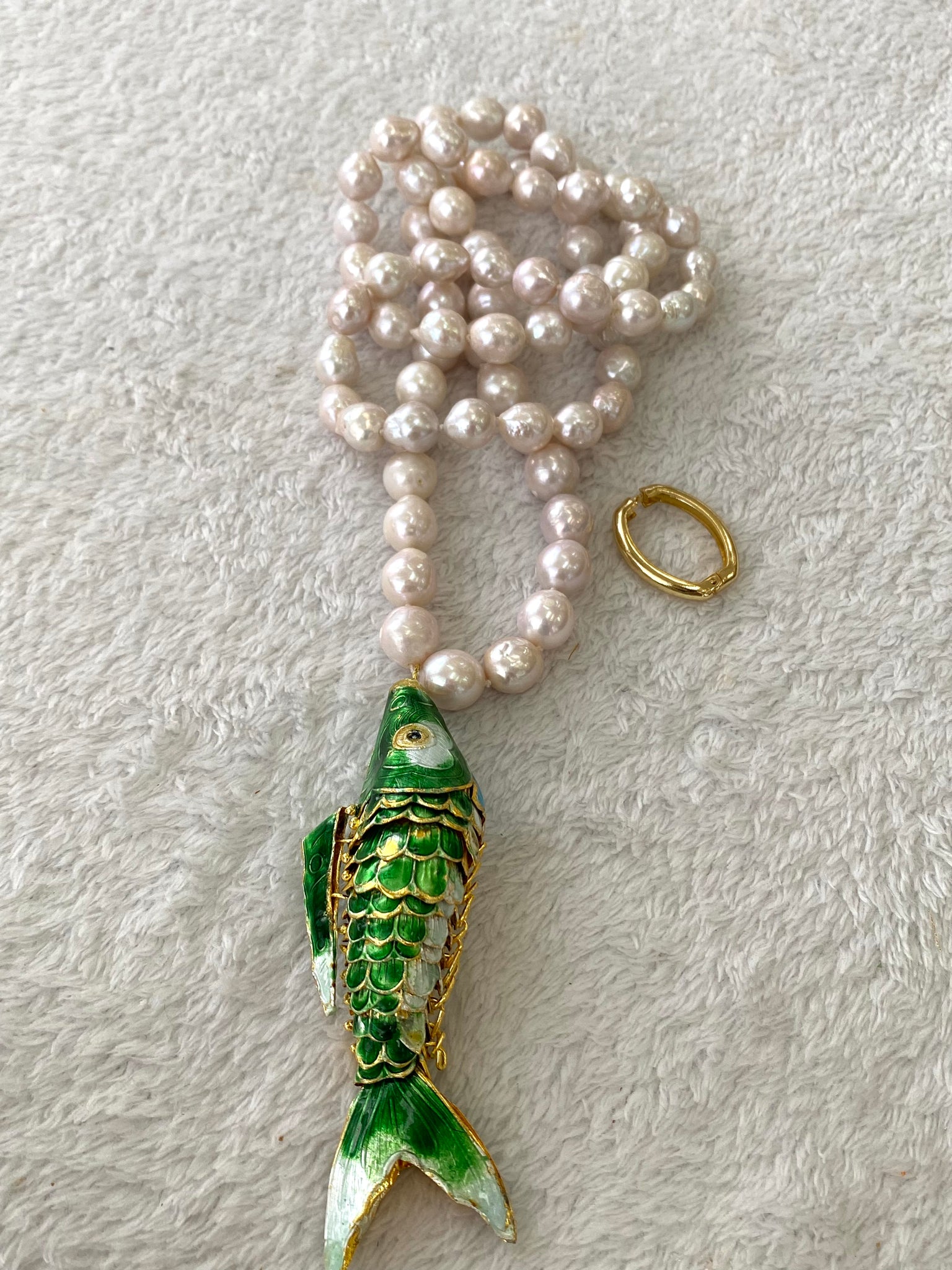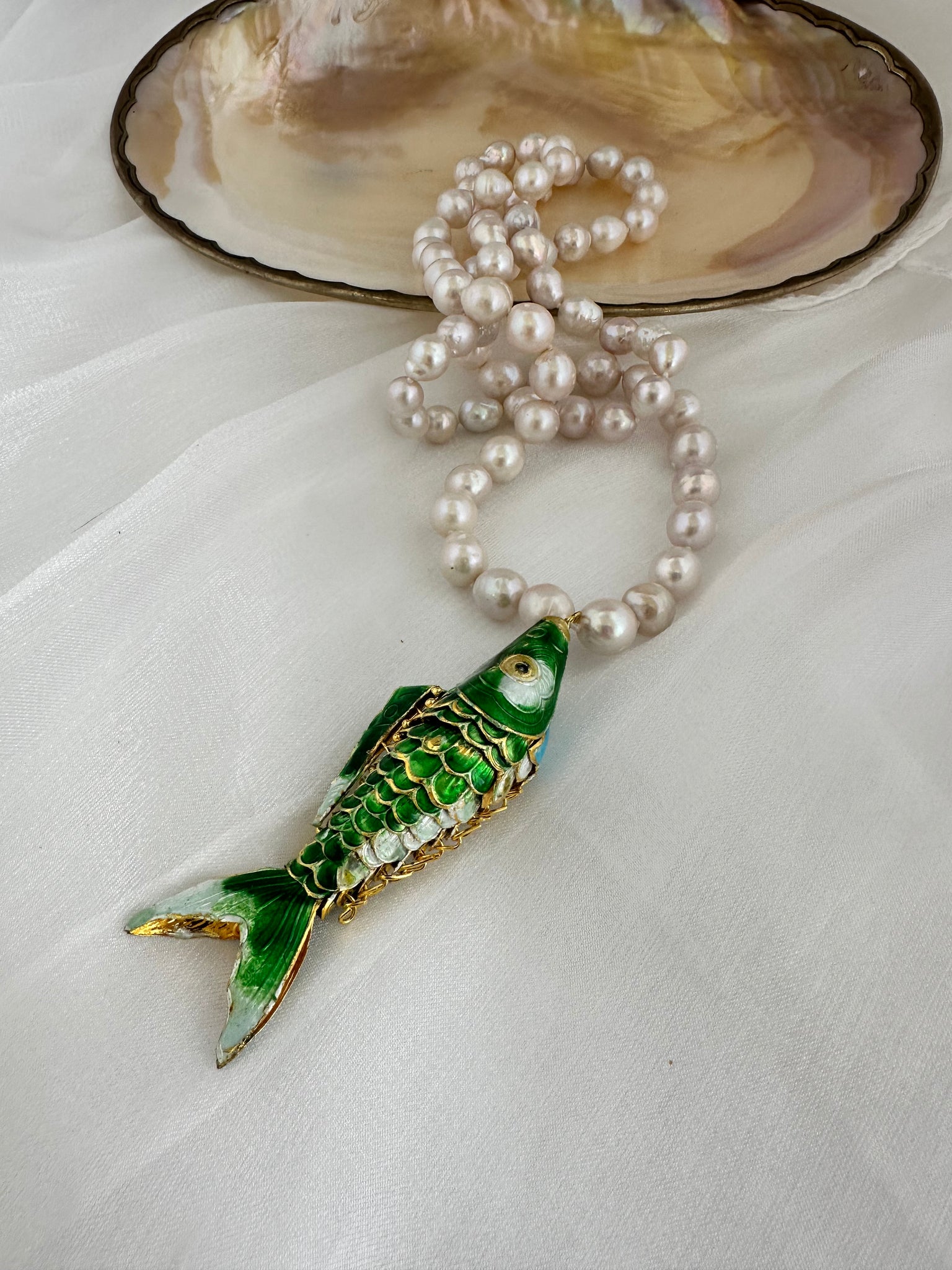 A statement long pearl necklace crafted with hand knotted 9–11mm white baroque pearls and finished with a large green cloisonné fish pendant, designed to be worn long or doubled for versatile styling.