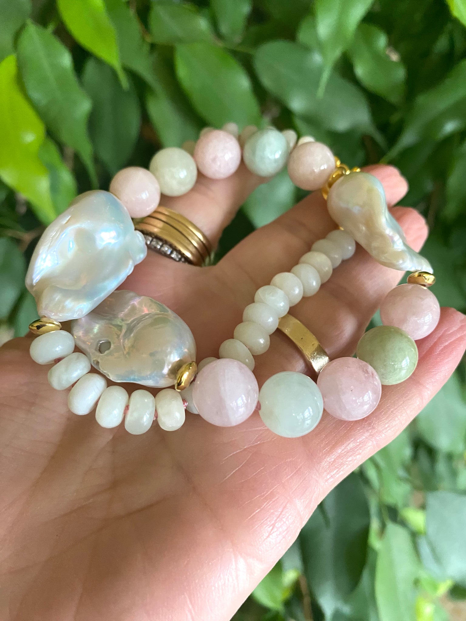 Morganite and Jade Necklace with Baroque Pearls – “Alina”