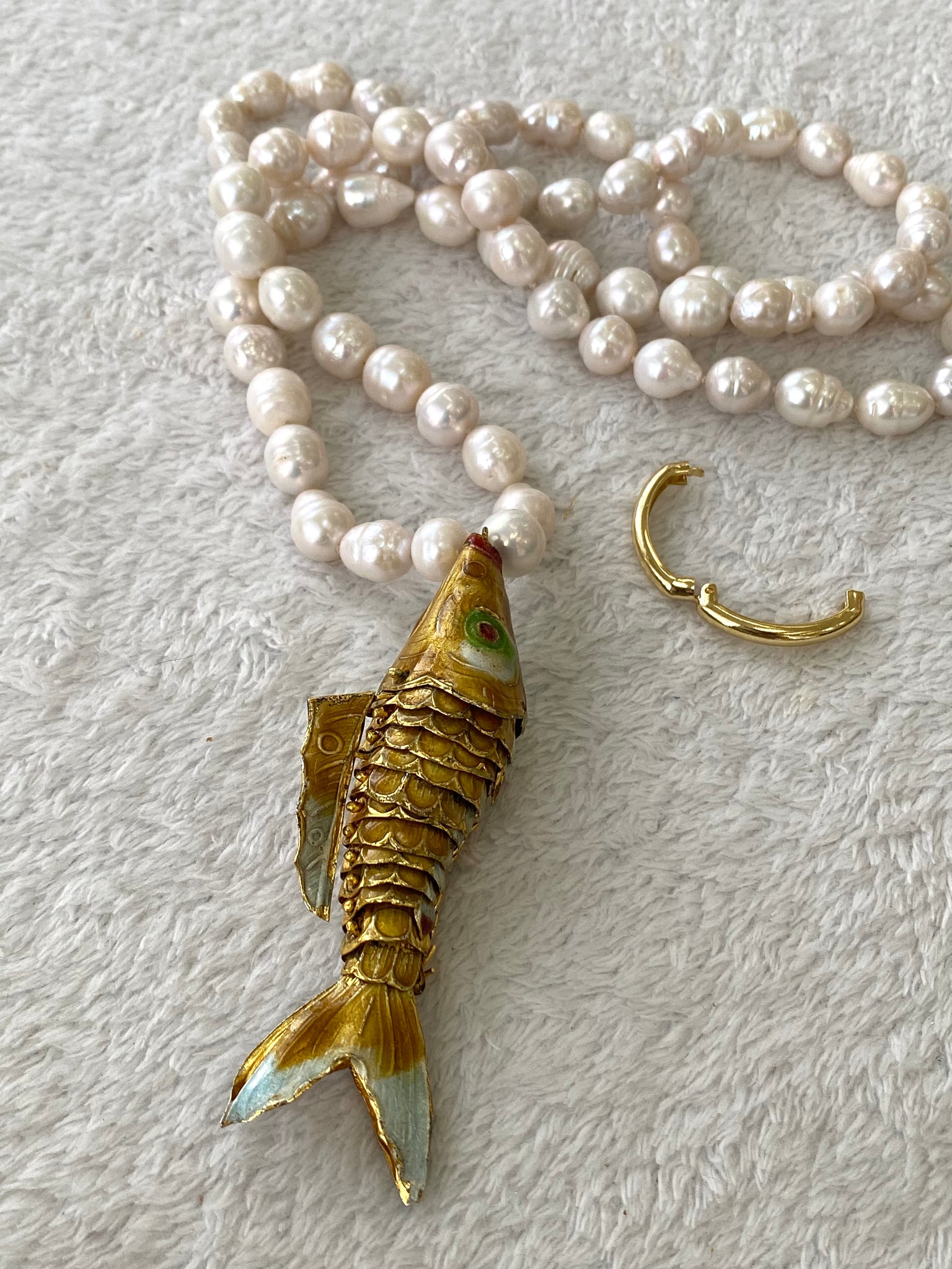 A statement long pearl necklace crafted with hand knotted 9–11mm white baroque pearls and finished with a large gold-tone cloisonné fish pendant, designed to be worn long or doubled for versatile styling.
