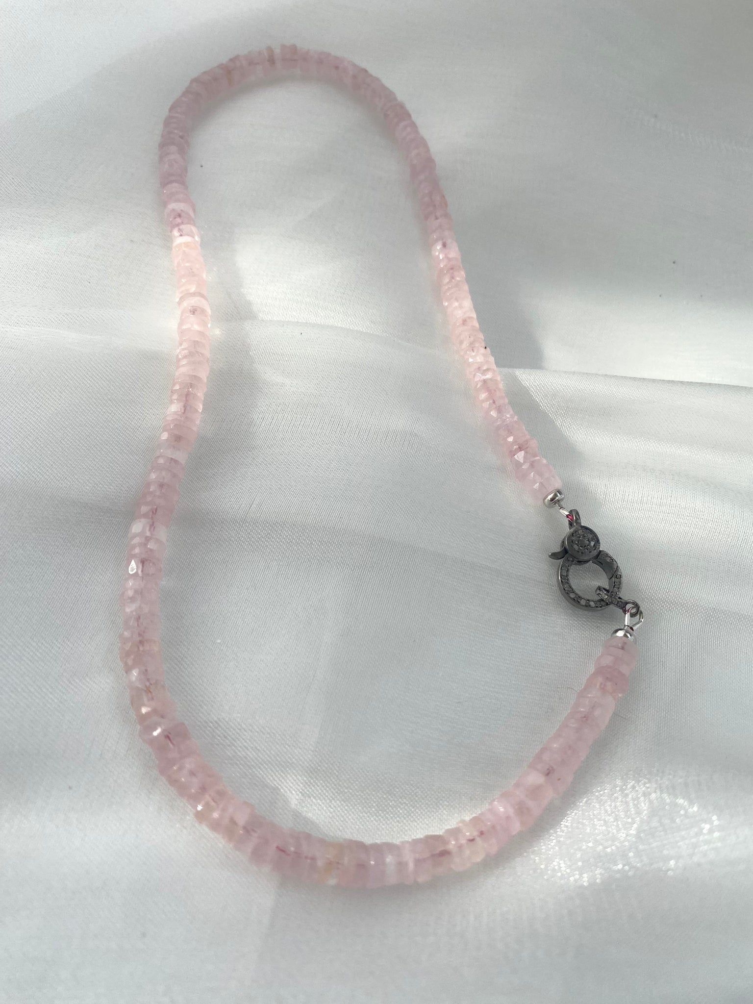 A soft and feminine faceted rose quartz necklace crafted with 6.5mm Indian-cut heishi beads and finished with an oxidized silver diamond pavé clasp.”