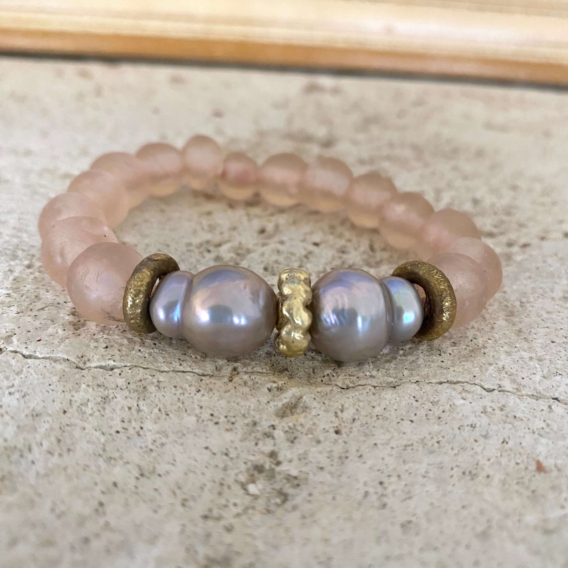 Grey Baroque Pearl Bracelet, Pale Pink Recycled Glass