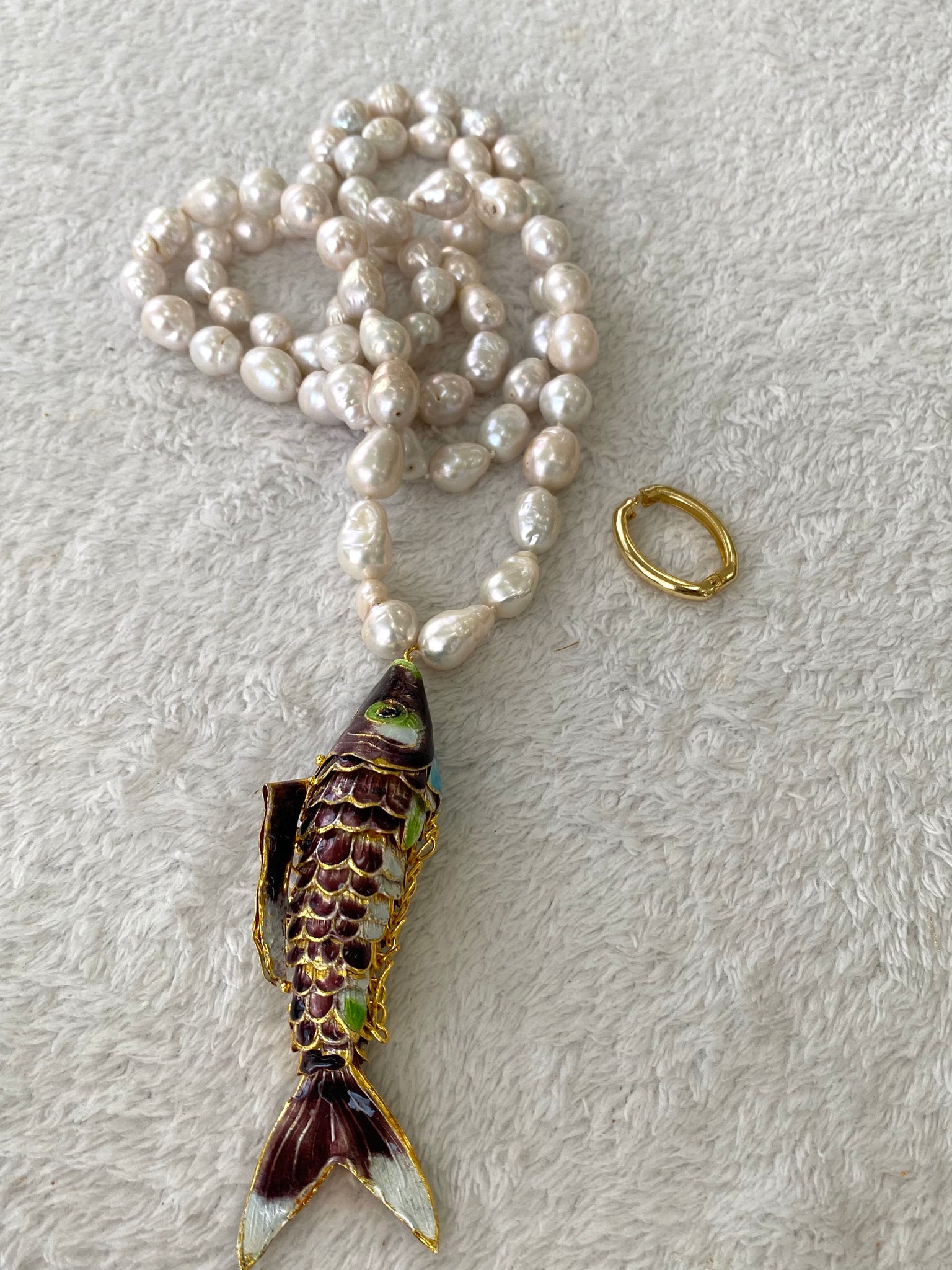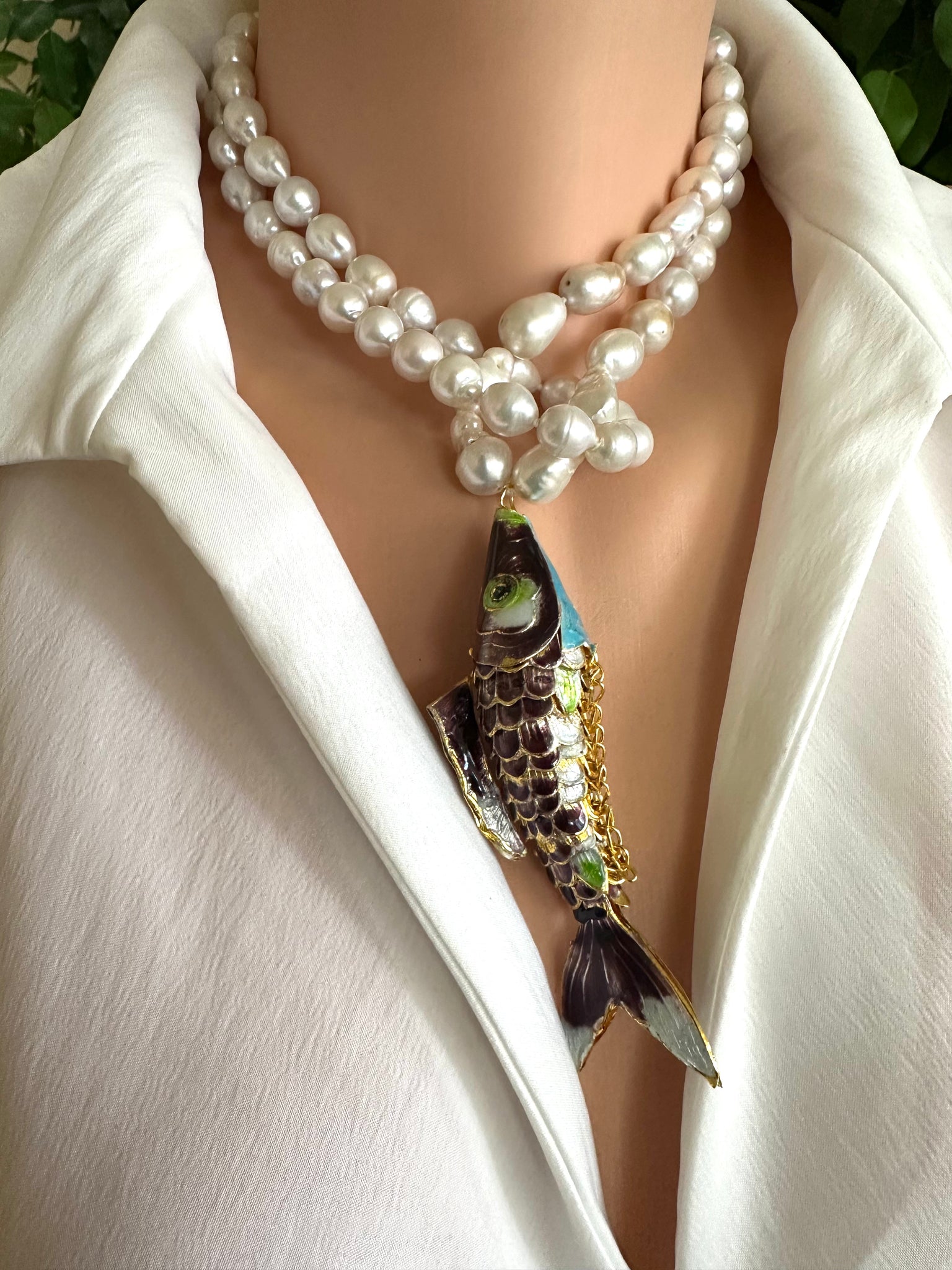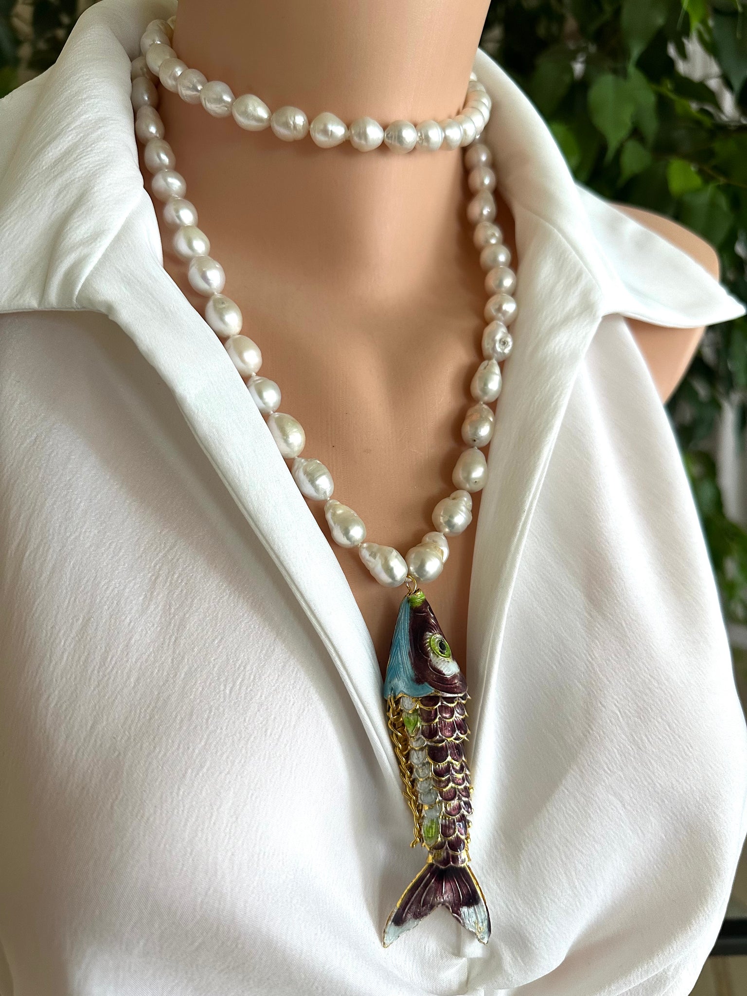 A statement long pearl necklace crafted with hand knotted 9–11mm white baroque pearls and finished with a large burgundy cloisonné Koi fish pendant, designed to be worn long or doubled for versatile styling.